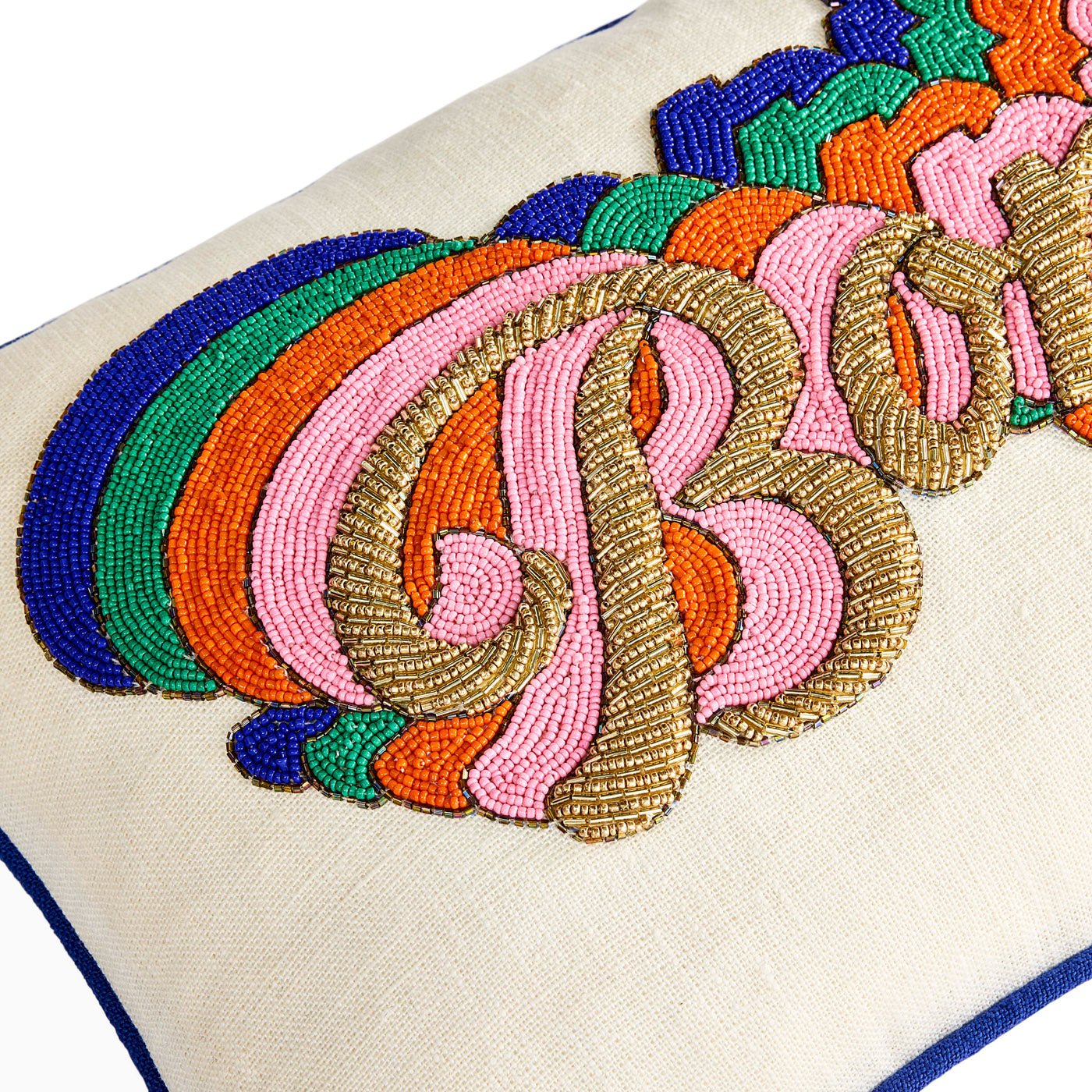 Abbiamo collaborato con un laboratorio artigianale in India, dove un maestro perlaio ha infuso nei nostri design grafici puliti artigianalità e anima. Ogni opera è realizzata a mano con perline su fondo di lino. Perline di diverse altezze e motivi all'interno di motivi creano un senso di profondità e dimensione. Il risultato è in parte pop art, in parte trionfo tessile.