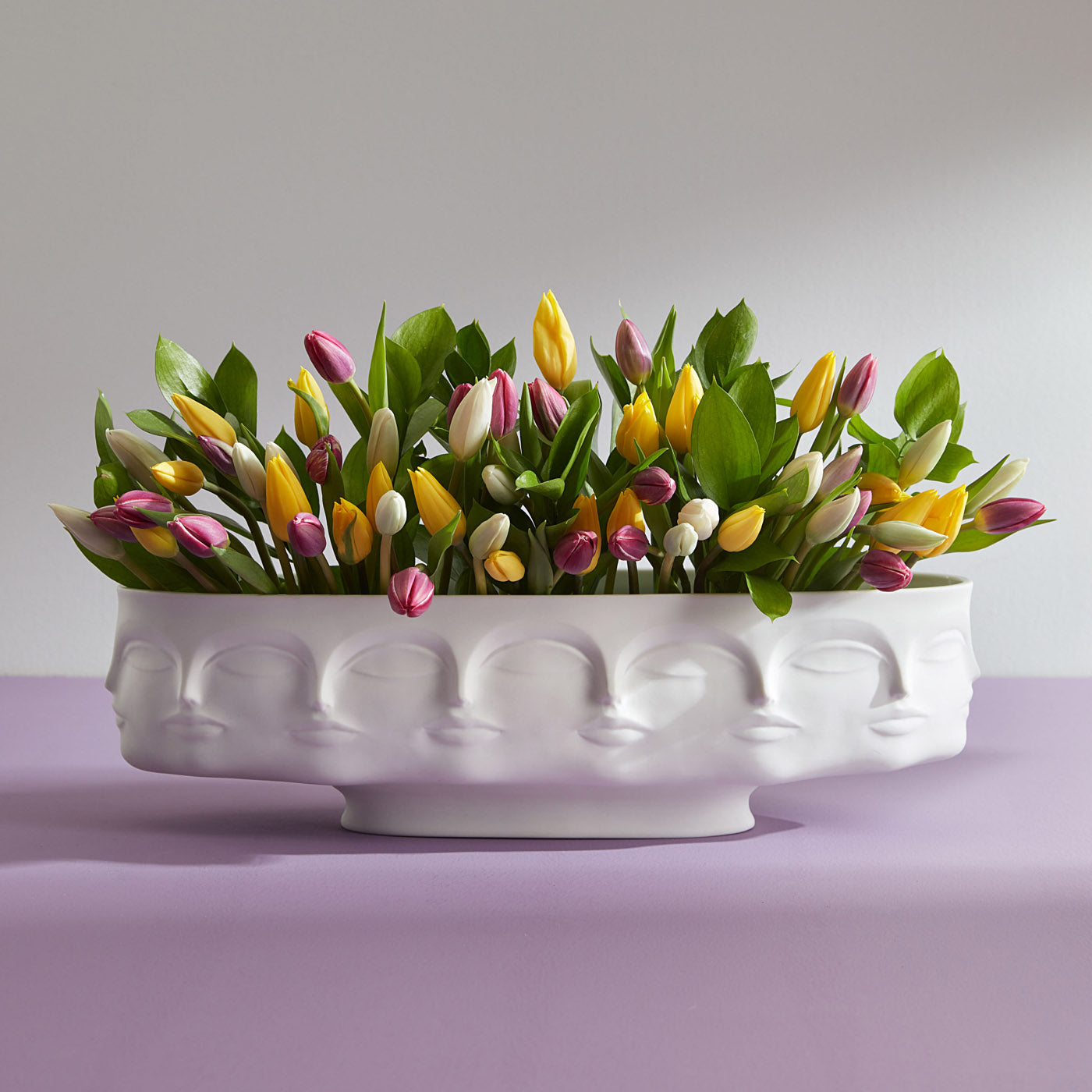 Servite il surrealismo con un oggetto funzionale che si distingue da ogni angolazione. Con il profilo della nostra musa ispiratrice, stratificato su tutto il perimetro, la nostra ciotola lunga Dora Maar è una delizia psichedelica su una consolle d'ingresso o un centrotavola chic per una tavola da sogno. Ispirata a Dora Maar, la fotografa, poetessa e pittrice francese, nota anche come amante e musa di Pablo Picasso.