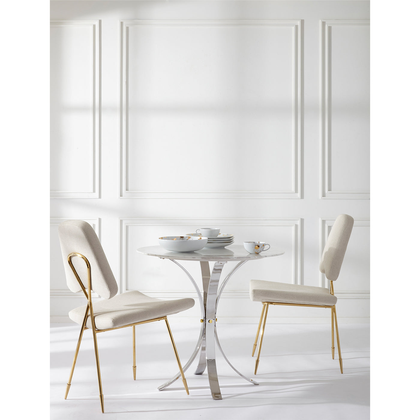 Le gambe svasate in nichel lucido sostengono un piano in marmo bianco da 32 piedi. I robusti bulloni in ottone ne accentuano il fascino.