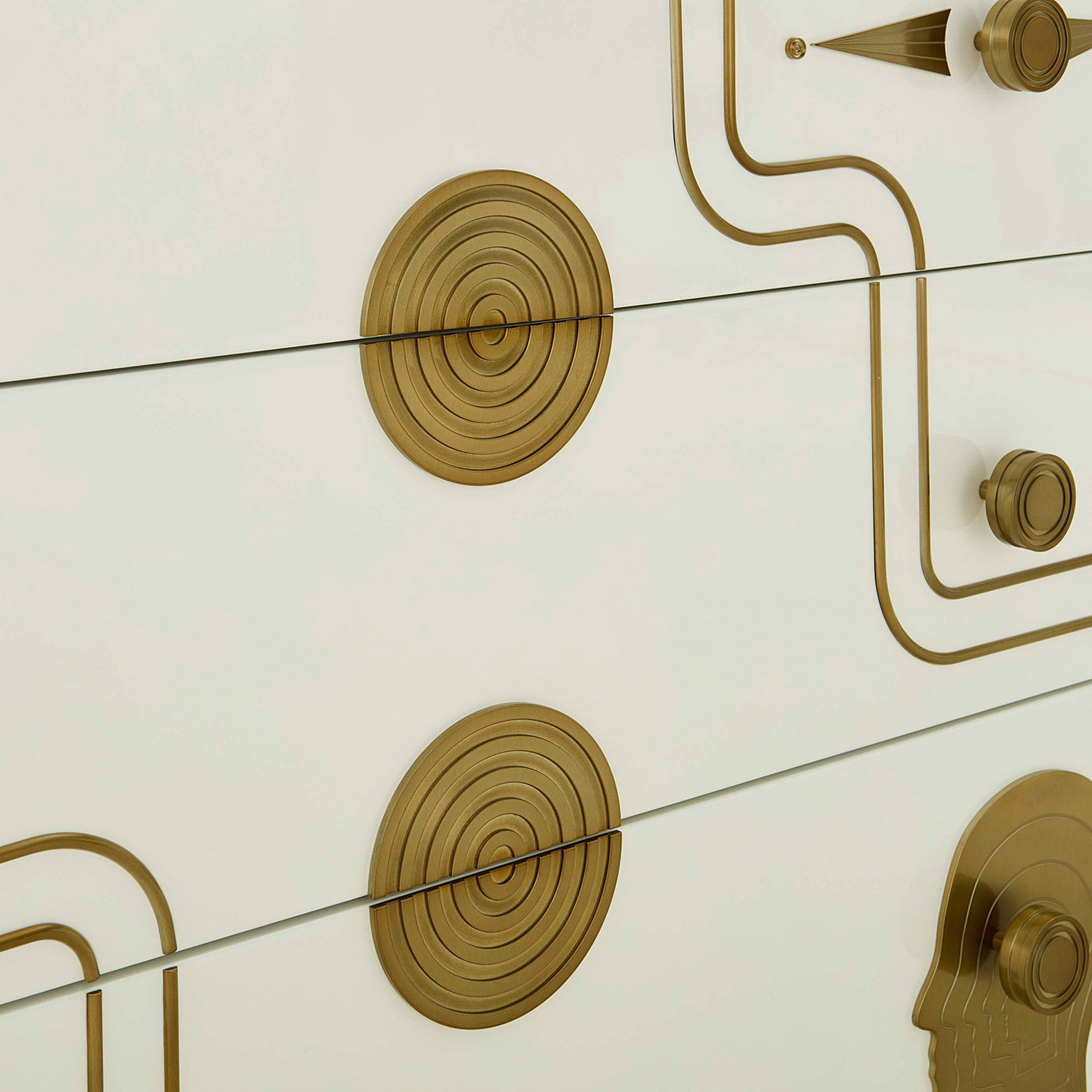 L'elegante stile cinese incontra il glamour ispirato agli anni '70 e un fascino senza tempo: la nostra cassettiera Gala ha tutto. Una cassa laccata bianca lucida su una base incassata fa da sfondo alla nostra rivisitazione in chiave moderna dei tradizionali elementi in ottone e delle decorazioni in ottone inciso. Con motivi tratti da alcune delle nostre collezioni preferite, incorniciati da angoli ispirati alle campagne pubblicitarie, questo è il pezzo che i vostri eredi si contenderanno. Completato da un piano in vetro temperato e dotato di tre ampi cassetti e due armadietti con un ripiano regolabile ciascuno. Un elemento di straordinaria funzionalità che ruba la scena a qualsiasi stanza.