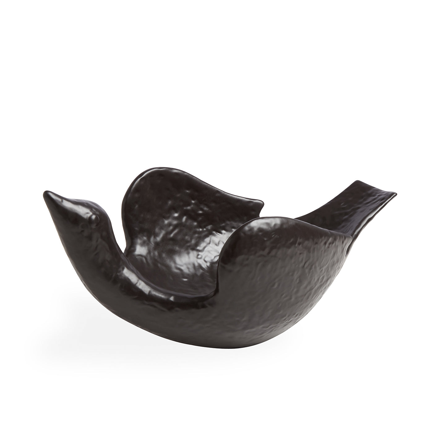 Coraggiosa ma raffinata, la nostra ciotola Vallauris Flying Bird è abbastanza spaziosa da dominare una tavola da pranzo o da cocktail. Una forma a forma di uccello semplificata con un cenno al primitivismo, realizzata in gres cotto a fuoco vivo con una ricca smaltatura a gocce d'olio che crea una texture leggermente screziata e reattiva.